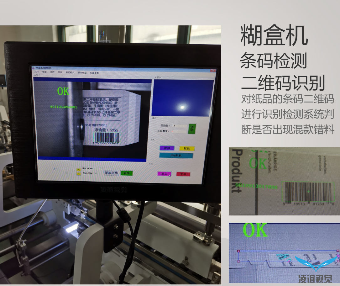 通常包裝廠生產(chǎn)的紙盒產(chǎn)品在出廠交貨前一道工序?yàn)檎澈校枵x視覺提供的糊盒機(jī)防混貨檢測系統(tǒng)是加裝在糊盒機(jī)臺上實(shí)現(xiàn)在線檢測,防止粘盒混貨,識別條碼防呆,保障產(chǎn)品出貨品質(zhì)。該粘盒防混貨檢測系統(tǒng)基于CCD機(jī)器視覺識別技術(shù),采用高速進(jìn)口工業(yè)相機(jī)設(shè)備,通過高速反應(yīng)的光電感應(yīng)觸發(fā),對每一個包裝盒子上的圖文、條碼、料號信息識別實(shí)時傳輸給由我公司自主研發(fā)的凌誼視覺檢測系統(tǒng),由視覺檢測系統(tǒng)進(jìn)行數(shù)據(jù)對比校驗(yàn)后判斷是否存在混貨串貨的情況,當(dāng)檢測到混貨產(chǎn)品時,系統(tǒng)實(shí)時進(jìn)行聲光報警同時由停機(jī)模塊輸出停機(jī)信號控制糊盒機(jī)停機(jī),把混貨產(chǎn)品停在相對固定的位置,方便查找和取出。